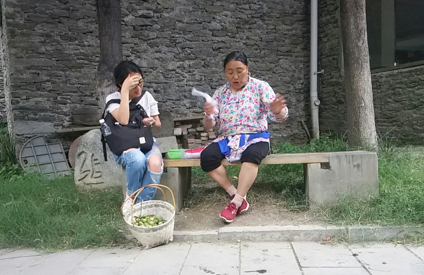 队员们融入到四位老人的交谈中,得知其中一位老人已四世同堂,最小的晚辈已经三岁大,家人在村寨里经营客栈。他们几个老年人就聚在一起做些针线活儿,其中一位老奶奶绣好马褂,穿在身上向一干老姐妹们展示,还会问问合不合适。