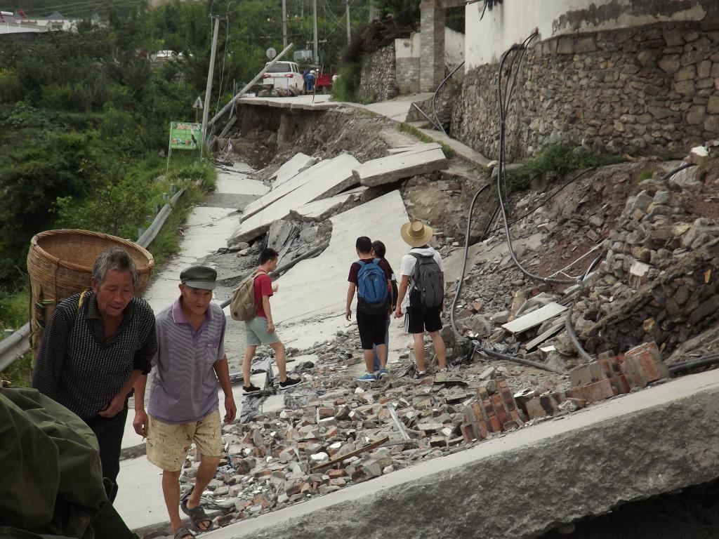 7月28日,队员们乘车向村寨前进,受到前几日暴雨天气的影响,当地部分道路已经塌陷,坐在车上零星可见路边山体滑坡、土石坍塌形成的泥石三角锥,受灾严重的地方可以见到推土机正在紧张作业。