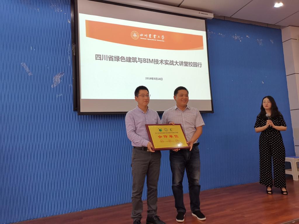 授予了“四川省绿色建筑与BIM技术实战大讲堂合作单位”。随后,冮军博士和黄元祥教授级高级工程师分别做了题为《BIM应用现状、价值与趋势》、《施工企业BIM应用现状、趋势与实战》的主题报告,用大量的数据与丰富的案例为老师和同学们分享了川内高等院校和企业工程技术人员在应用绿色建筑与BIM技术中的实战经验,这对于学院下一步在绿色建筑及BIM技术的人才培养、社会服务、科研成果转换等方面有着积极的启示与推动作用。