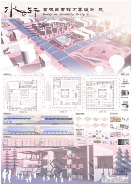 该设计作品是由2018级建筑学专业学生高雅婷完成的高校图书馆建筑设计。在侯超平副教授的指导下,高雅婷积极关注图书馆在使用过程中的舒适性、便捷性,调查学生及教师对于图书馆在使用功能上的诉求,综合考虑场地的气候特征,结合建筑生态化,提取当地的文化元素进行构思设计,命名《水云轩》,旨在思考出一个既有当地文化特色,又可以最大程度上满足使用者对于图书馆功能需求、丰富其使用体验的高校图书馆设计方案。