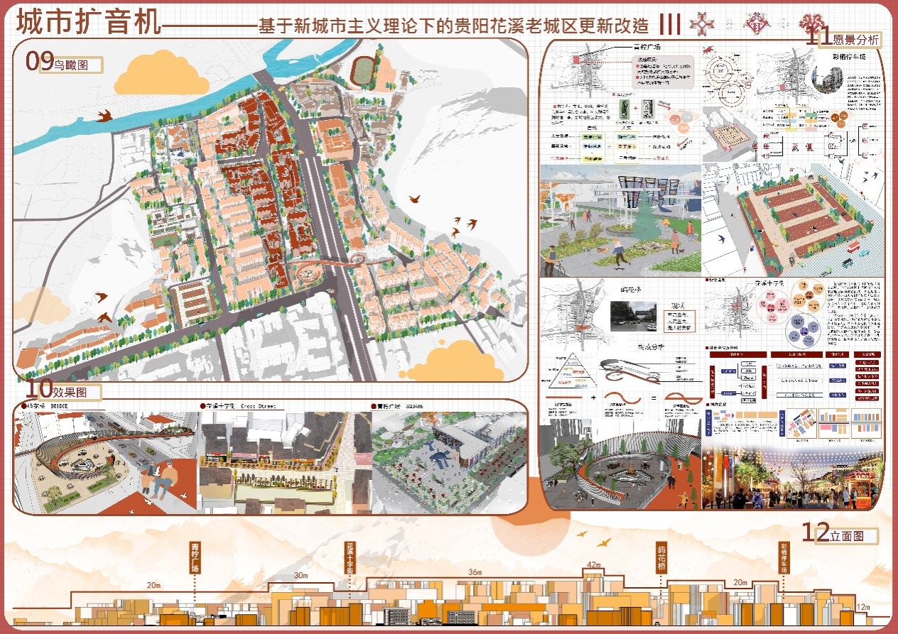 丁宇辉、顾天纬2位老师指导,城乡规划专业王可芯、阮子茹、王秋月、魏语榕、吴坚共同创作的作品《城市扩音机--基于新城市主义理论下的贵阳花溪老城区更新改造》获得提名奖。