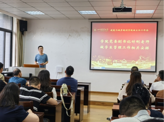 在2C405召开学院班主任大会,就学生管理工作和近期本科教育教学审核评估工作做了相关安排部署,学院党委书记申琼、党委副书记付刚、全体班主任参加会议,会议由党委副书记付刚主持。