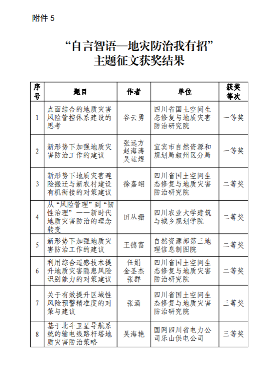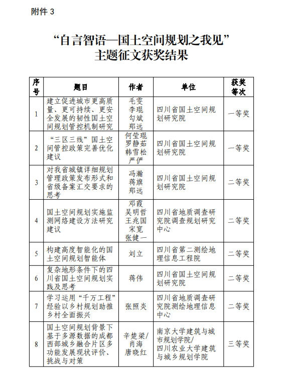 “自言智语”主题征文大赛是四川省自然资源厅贯彻落实《"十四五"自然资源保护和利用规划》的重要行动,致力于推动自然资源治理数字化转型,围绕新时代自然资源管理的关键议题推动理论与实践创新,通过设置"地灾防治我有招""国土空间规划之我见"等赛道,精准对接国家"用AI重塑行业新质生产力"的发展要求。学院田丛珊老师聚焦地质灾害防治的科技化转型,以《从"风险管理"到"韧性治理"——新时代地质灾害防治理念跃迁》荣获等奖;唐晓红、肖海老师及城乡规划专业2019级毕业生辛楚梁共同聚焦国土空间规划体系的优化重构,以《国土空间规划与城乡融合发展的多源数据应用研究》荣获三等奖。