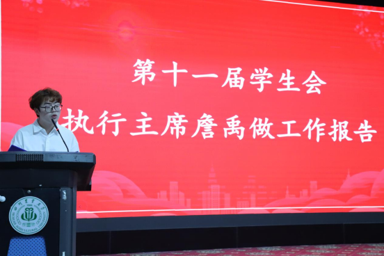 第十一届执行主席詹禹进行本届院学生会工作成果汇报,强调下阶段工作重点,对未来规划与发展方向做出工作展望。他提出,学生会当下应完善育人体系,对院内学风进行整顿、创新,并优化学院育人矩阵。接下来,全体参会代表依次表决通过了《学代会常任代表选举办法(草案)》,大会总监票人、监票人、计票人名单,《学生会主席团选举办法(草案)》和《学代会常任代表会议会长、副会长选举办法(草案)》
