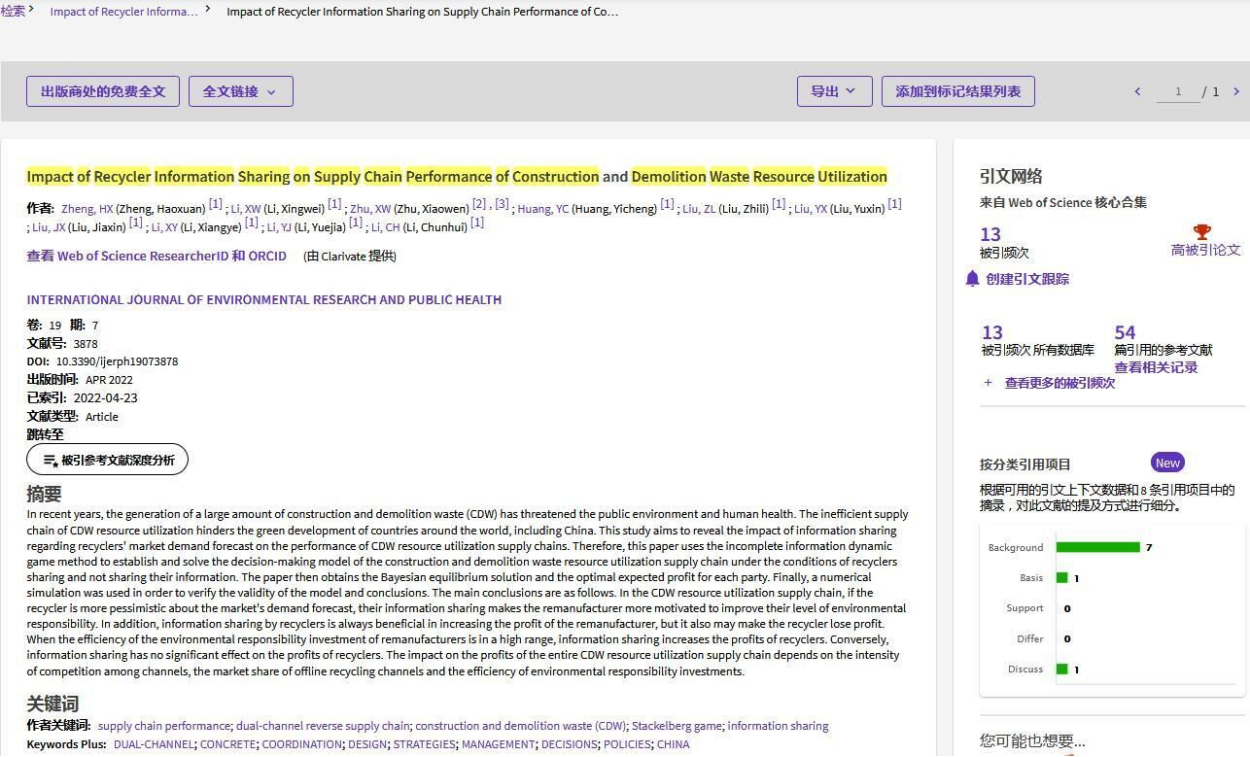 为第一单位在SSCI源刊《International Journal of Environmental Research and Public Health》期刊上发表的研究论文“Impact of Recycler Information Sharing on Supply Chain Performance of Construction and Demolition Waste Resource Utilization”(出版日期:2022年3月,19卷第7期,DOI:10.3390/ijerph19073878)继2023年1月被ESI数据库遴选为全球Top 1%环境与生态学领域高被引论文以来,2023年3月再次被遴选为高被引论文。论文链接://doi.org/10.3390/ijerph19073878