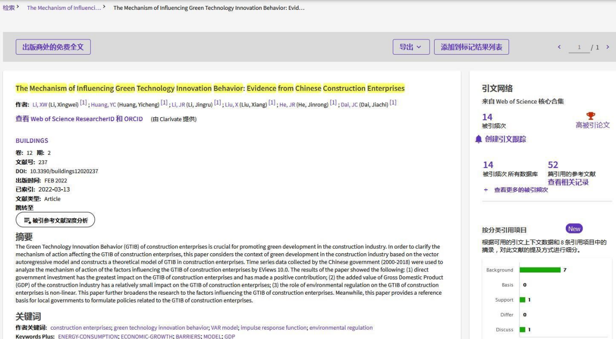 为第一单位在SCI源刊《Buildings》期刊上发表的研究论文“The Mechanism of Influencing Green Technology Innovation Behavior: Evidence from Chinese Construction Enterprises”(出版日期:2022年2月,12卷第2期,DOI:10.3390/buildings12020237)继2022年11月、2023年1月被ESI数据库遴选为全球Top 1%工程学领域高被引论文以来,2023年3月再次被遴选为高被引论文。论文链接://doi.org/10.3390/buildings12020237