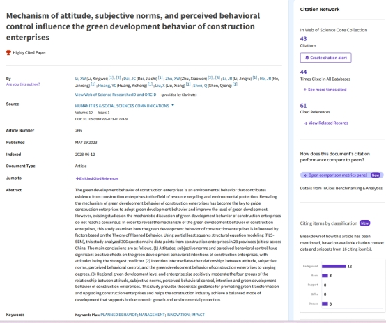 (论文原文链接:Li, X., Dai, J., Zhu, X., Li, J., He, J., Huang, Y., Liu, X. & Shen, Q. (2023). Mechanism of attitude, subjective norms, and perceived behavioral control influence the green development behavior of construction enterprises. Humanities and Social Sciences Communications, 10(1), 266.)