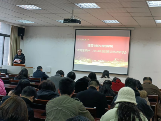 为贯彻落实习近平总书记关于大力弘扬教育家精神的重要指示,营造全院学习和弘扬教育家精神的良好氛围,厚植学院教师躬身教坛、强国有我使命感,3月5日下午,建筑与城乡规划学院全院教职工在2C405举行“教育家精神”2024年巡回宣讲活动走进四川集中学习会,学习会由学院党委书记申琼主持。