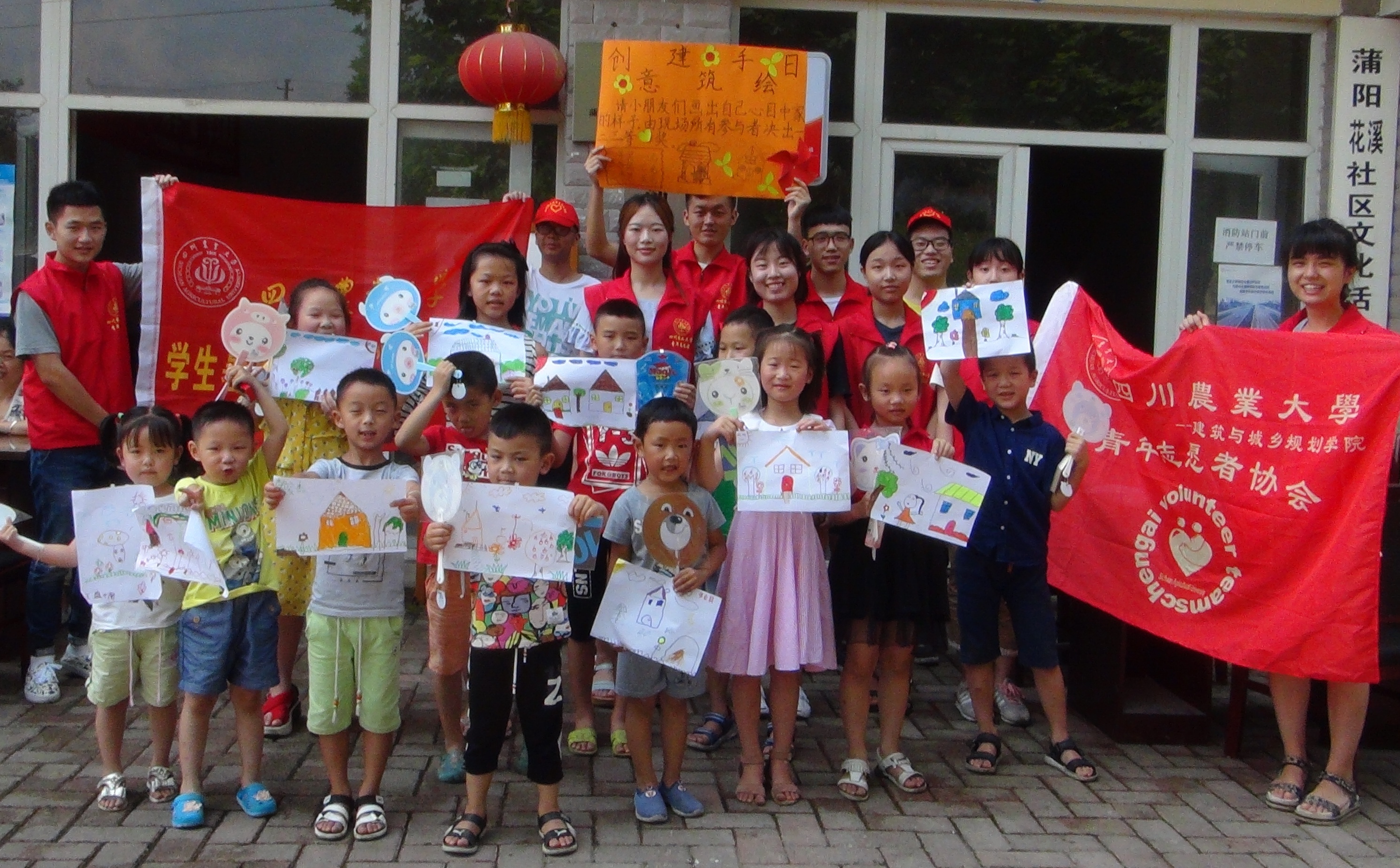的志愿者们,和在场所有小朋友们一齐合影留念。在这一上午的工作中,川农志愿者们将自己的激情,热血和青春释放在这片都江堰的土地上,换来如今镜头前这一张张灿烂笑脸。川农志愿者的心更加坚定,他们希望在今后的日子里,往更多人的脸上蒙上一层笑意,亮晶晶,闪烁,耀眼。