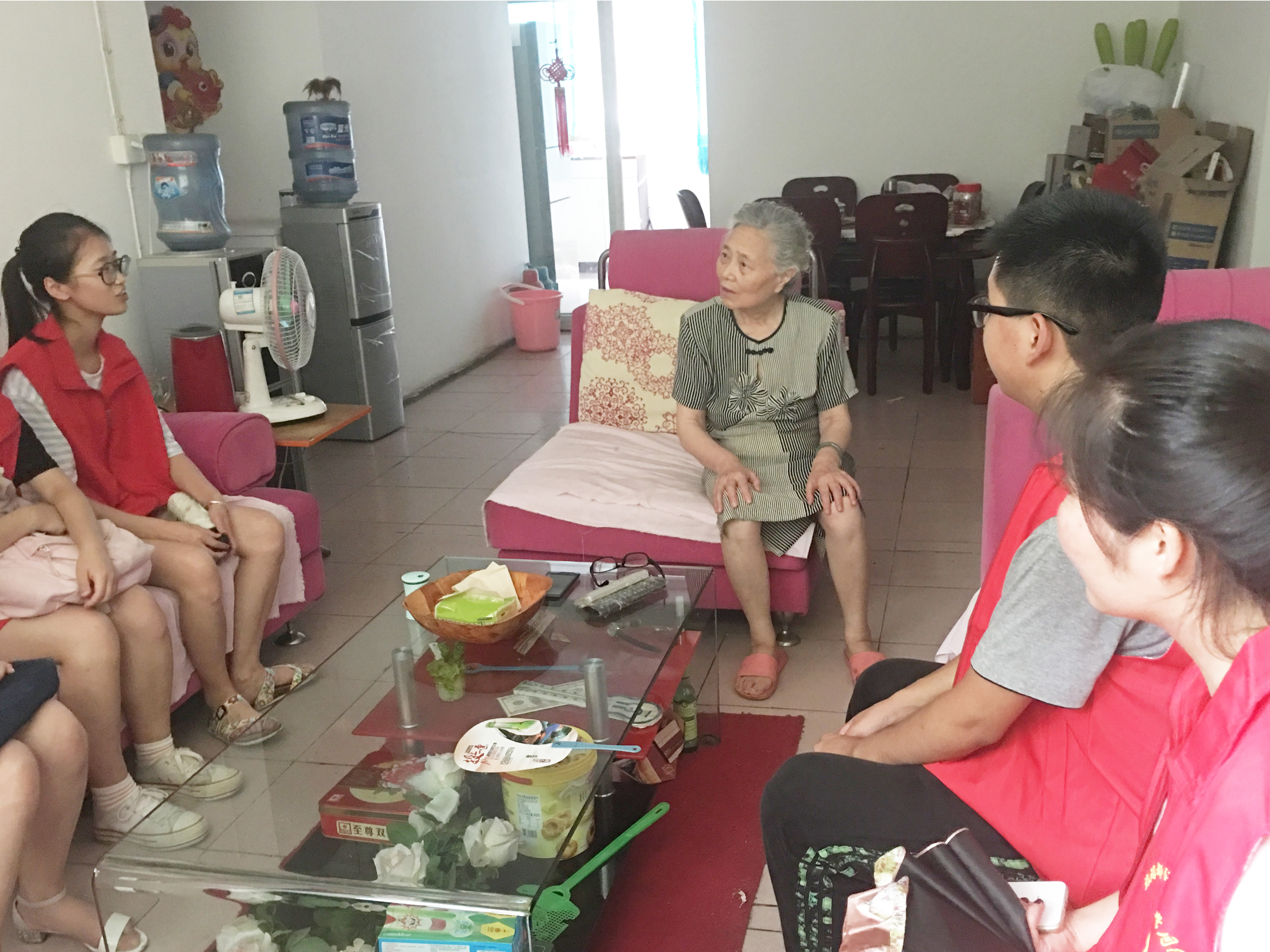 杨大爷今年也是八十多岁了,但身体依然健朗,虽然和儿女分开来住,但他们经常来看杨大爷,时时问候,也没有觉得多孤独。同学刚进杨大爷家时,他很是热情,叫大家坐,吃水果。他平时关注新闻时事比较多,家事国事天下事,事事关心。对于前段时间发生的为争篮球场大爷暴打年轻小伙,杨大爷坚决表明这位大爷的做法是错误的。他说“现在的年轻人学习工作压力大,作为老一辈的人呐,身体能力上支持不了他们,但作为基本的人心换人心、互相体谅的思想总应该懂得吧。”所有队员都被杨大爷的这番话所感动,当我们挥手作别时,杨大爷硬是要拄着拐杖送我们到大门外,看着同学们走远了他才转头回去。