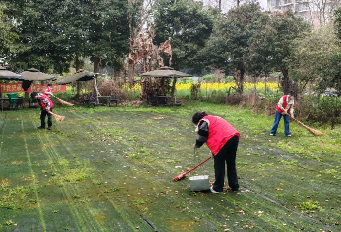 图为志愿者清扫院落