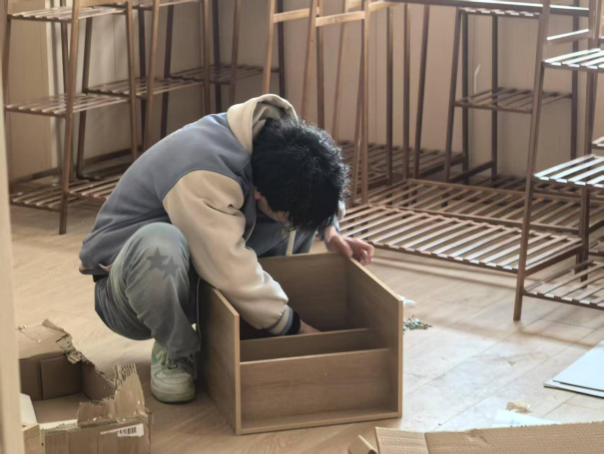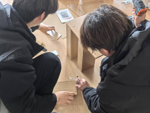 9完成基础清洁后,志愿者们迎来新挑战——组装卧室床头柜。面对堆积的木板零件,工程专业的王业童主动担任指导,演示如何将图纸转化为操作步骤。"先固定侧板螺丝,注意区分长短板件。"志愿者们分工协作,有的拧螺丝,有的核验细节。随着"咔嗒"声此起彼伏,零散板材逐渐变成整齐的床头柜。