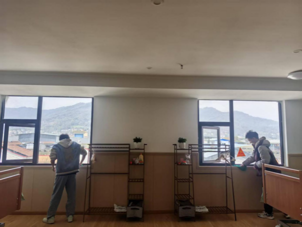 下午两点,志愿者们准时来到养老院,手持扫帚、抹布等工具,分组对公共区域及新装修房间进行清洁。走廊扶手被反复擦拭,装修残留的木屑也被逐一清理。部分同学蹲身拾起零碎工具,将装好的零件分类归置。"为老人们做好入住准备,把卫生做到细致,想到未来能在这样整洁的环境里陪老人聊天,我很期待。"工程3班的李林奕边说边清扫木屑。两小时后,焕然一新的养老院里,阳光透过明净的窗户洒在光洁的木地板上,静候新主人的到来。
